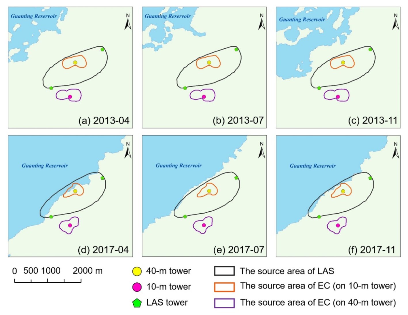 图2 官厅水库的季节性进退特征及2013年、2017年官厅水库的季节性进退与大孔径闪烁仪(LAS)和涡动相关仪(EC)观测源区(图中实线范围)的关系。在水库扩张之前(2013年),观测源区内全年无水体;而在水库扩张之后(2017年),春季(4月)和冬季(11月)水库季节性扩张导致LAS源区内水体所占比例最大,夏秋季(7月)水库季节性收缩使源区内水体比例较小。这体现了非生长季时水库的季节性扩张对周边地区水热通量的直接影响。