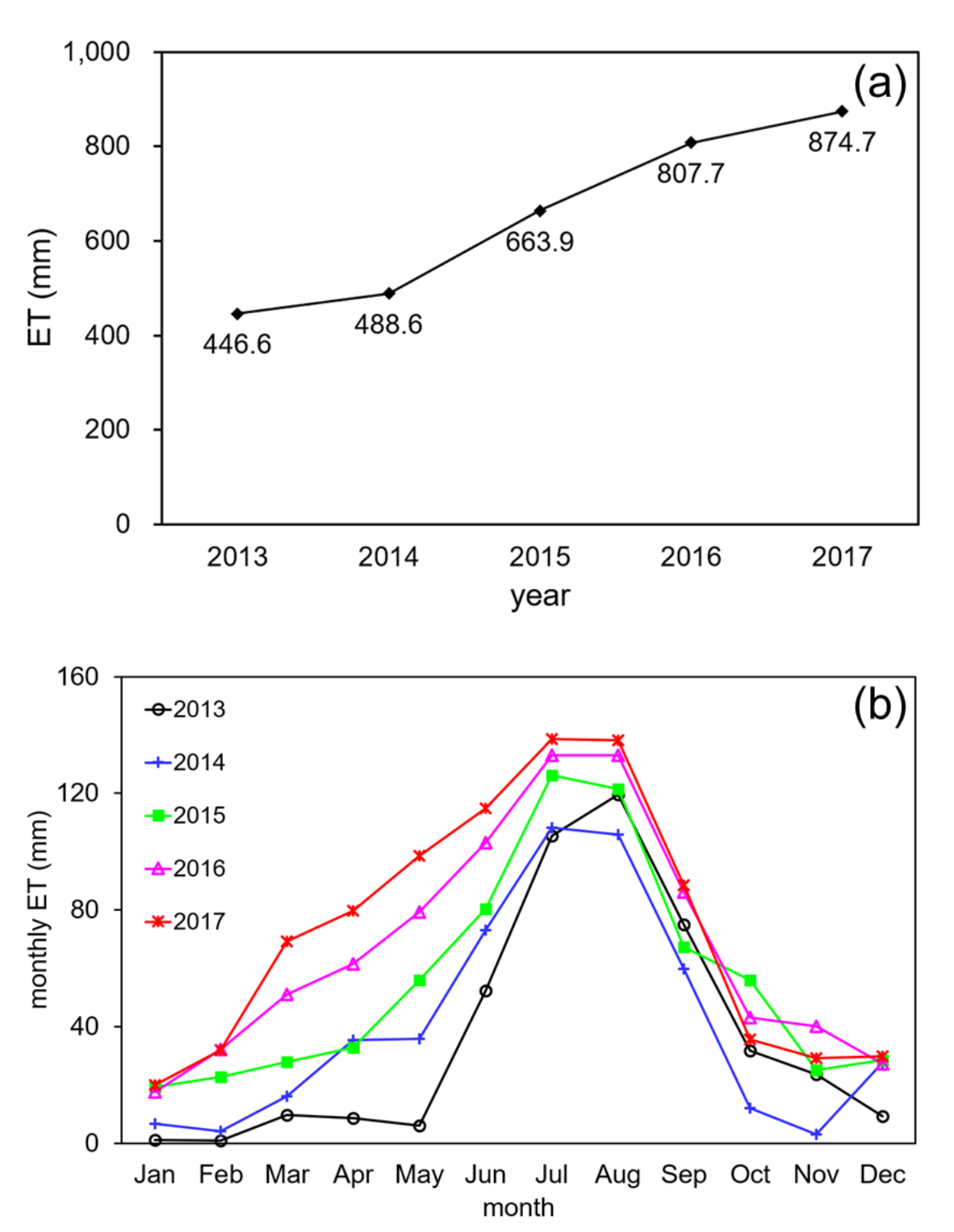 图3 2013-2017年官厅水库周边地区蒸散量的(a)年际变化和(b)季节变化。随着水库逐年扩张,周边地区的年蒸散量逐年增加,且呈现春季增加明显、夏秋季节不变、冬季再次增加的季节变化特征。
