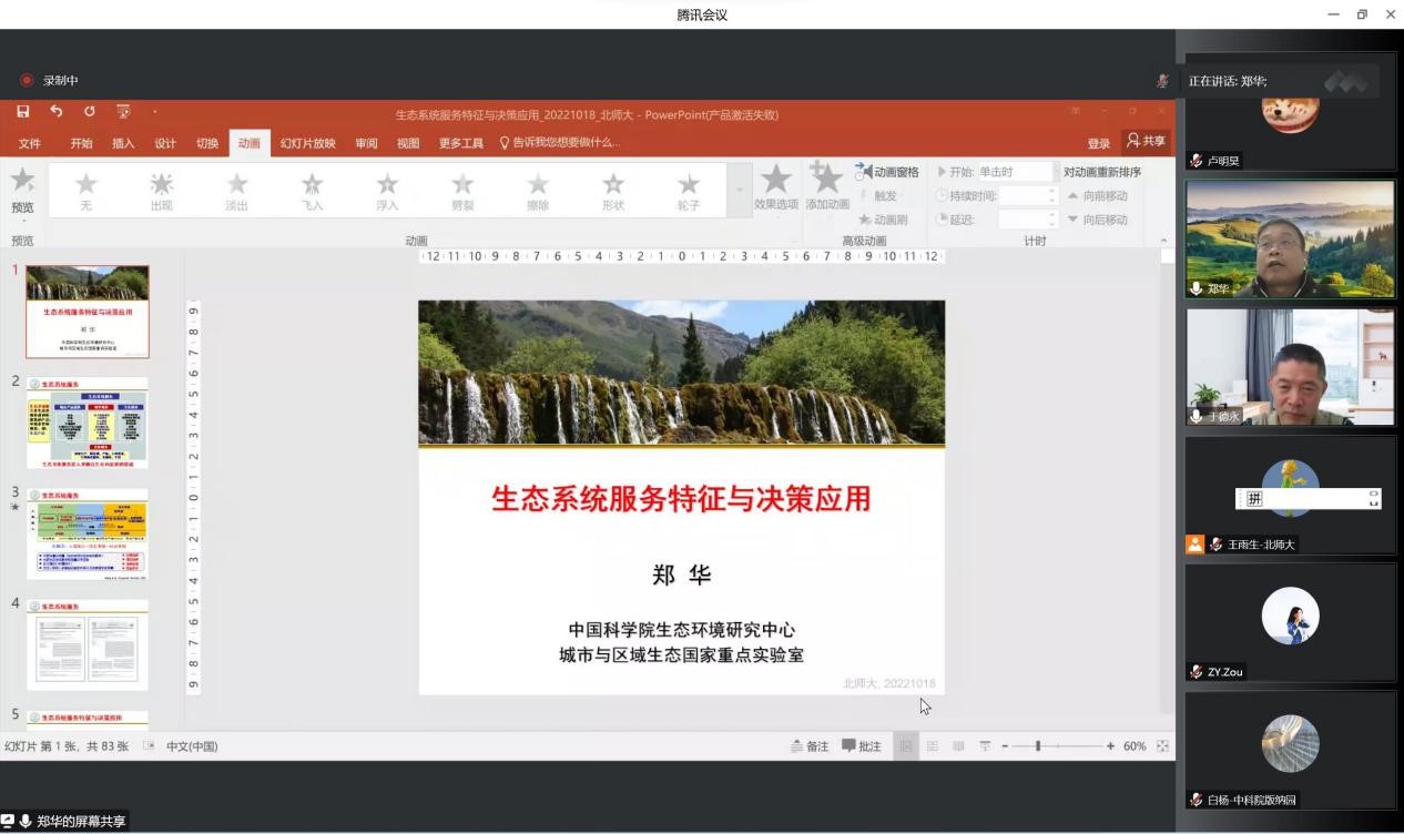 2022年10月18日上午,琉璃神社 自然资源学院资源科学前沿系列讲座第八期——“生态系统服务特征与决策应用”成功举办。本次讲座由于德永教授主持,邀请了中国科学院生态环境研究中心城市与区域生态国家重点实验室副主任、国家杰出青年科学基金项目获得者郑华研究员为主讲嘉宾,讲座以线上会议的形式进行,吸引了校内外三百余名业内专家及学生参加。