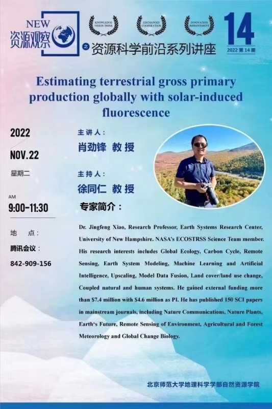 2022年11月22日,资源科学前沿系列讲座第14期在线上顺利召开。讲座由徐同仁教授主持,邀请了美国新罕布什尔大学肖劲锋教授作“Estimating terrestrial gross primary production globally with solar-induced fluorescence”主题报告,并与百余名校内外参会者进行了交流和讨论。