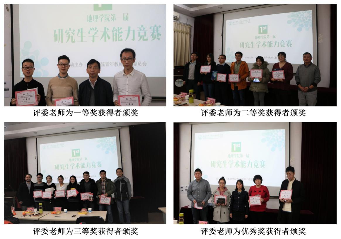 经评委老师综合打分,结合初赛成绩,傅天阳、周创文、张滔3位同学获得本次研究生学术能力竞赛一等奖;王亚安、丁之勇、刘宇帆、夏海萍、荔琢5位同学获得二等奖;温仰磊、王中原、方成、叶滨鸿、王晓雅、吕金霞6位同学获得三等奖;郑浩、赵韶雅、陈艳玲、秦桐4位同学获得优秀奖。评委老师们为获奖选手颁发了奖状和奖品并合影留念。