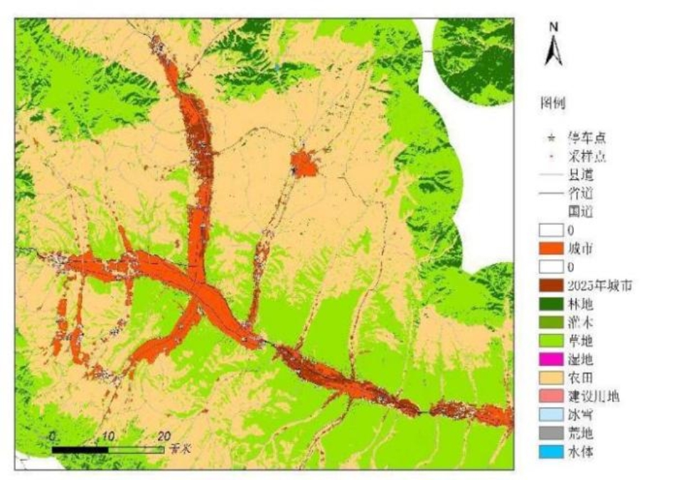 考察路线、模拟的西宁市扩展区以及拍摄的高分影像