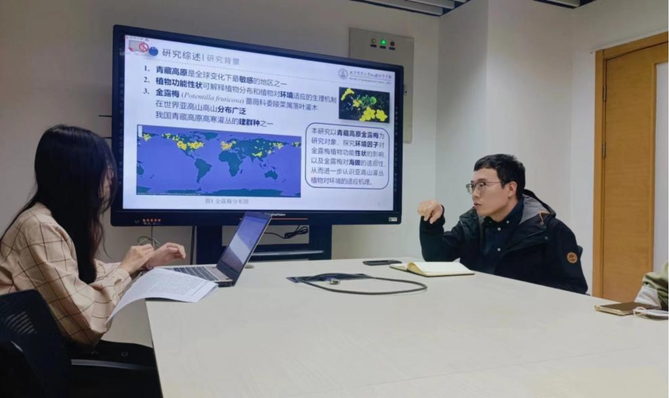 刘一瑶同学的汇报聚焦于青藏高原金露梅的研究,旨在探究环境因子对金露梅性状的影响。研究结果显示,气候和土壤条件对金露梅功能性状的变异贡献较大,降水和土壤养分对植物功能性状的影响最显著。她还综合分析了金露梅多种性状对环境的响应,为预测全球变化下金露梅分布范围等生态学变化提供了有力的依据,也为高寒区植被保护提供了重要参考。刘一瑶同学结束汇报后,同学们进行了深入讨论。