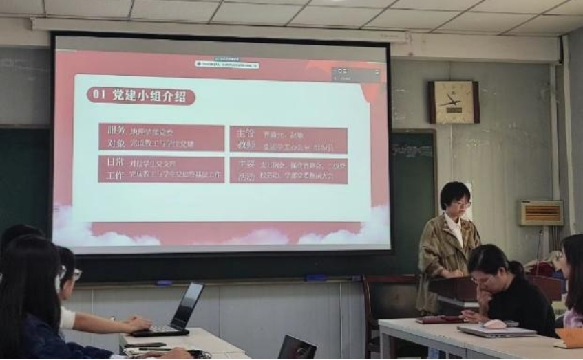 接着,党建小组负责人对党建小组进行总体介绍,包括服务对象、主管教师、日常工作、主要活动等方面,随后,党建小组各负责人对各部门的职责、人员分工、近期工作计划以及对各党支部的考核标准进行了具体介绍,并强调了各支部接下来的工作重点与注意事项。