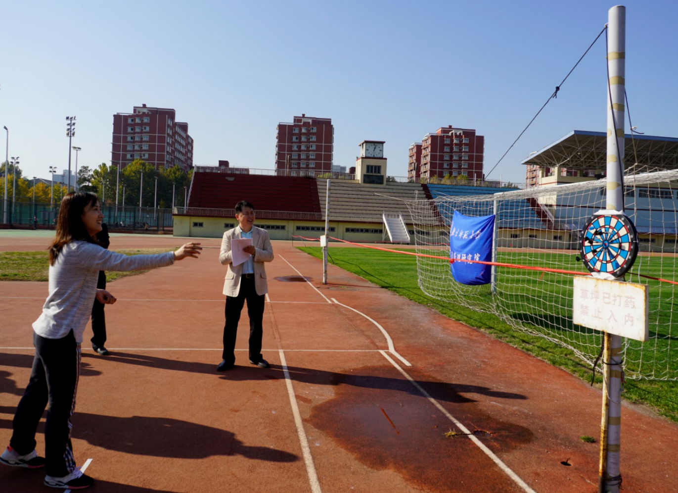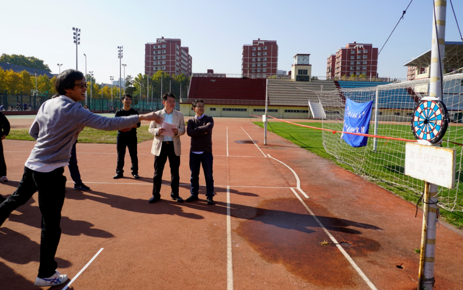 接下来男老师上场,龚道溢老师率先上场,自信的他这次把镖盘当做乒乓球台,赫赫有名的男乒冠军,岂甘认输,镖一出手就直奔草坪而去,不服,再来!镖呢,怎么又飞外面了?等等,龚冠军,我给你拍张照……最终,龚老师还是取得了不错的成绩。随后毛睿老师,徐伟老师等其他老师也纷纷上场,投出去镖纷纷中靶,老师们欢声笑语,尖叫声、欢呼声回荡在操场的上空。