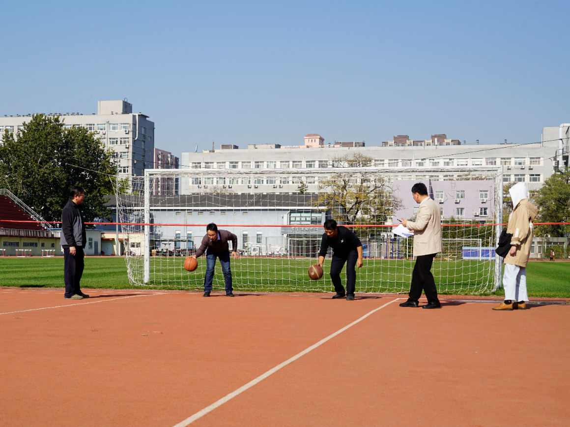 篮球拍、运球快跑活动中,“预备——,跑”,随着计时老师的一声令下,陶军老师、张化老师开始快速拍球20次,然后突然起跑,两位老师的身影像那离弦之箭一般冲了出去……