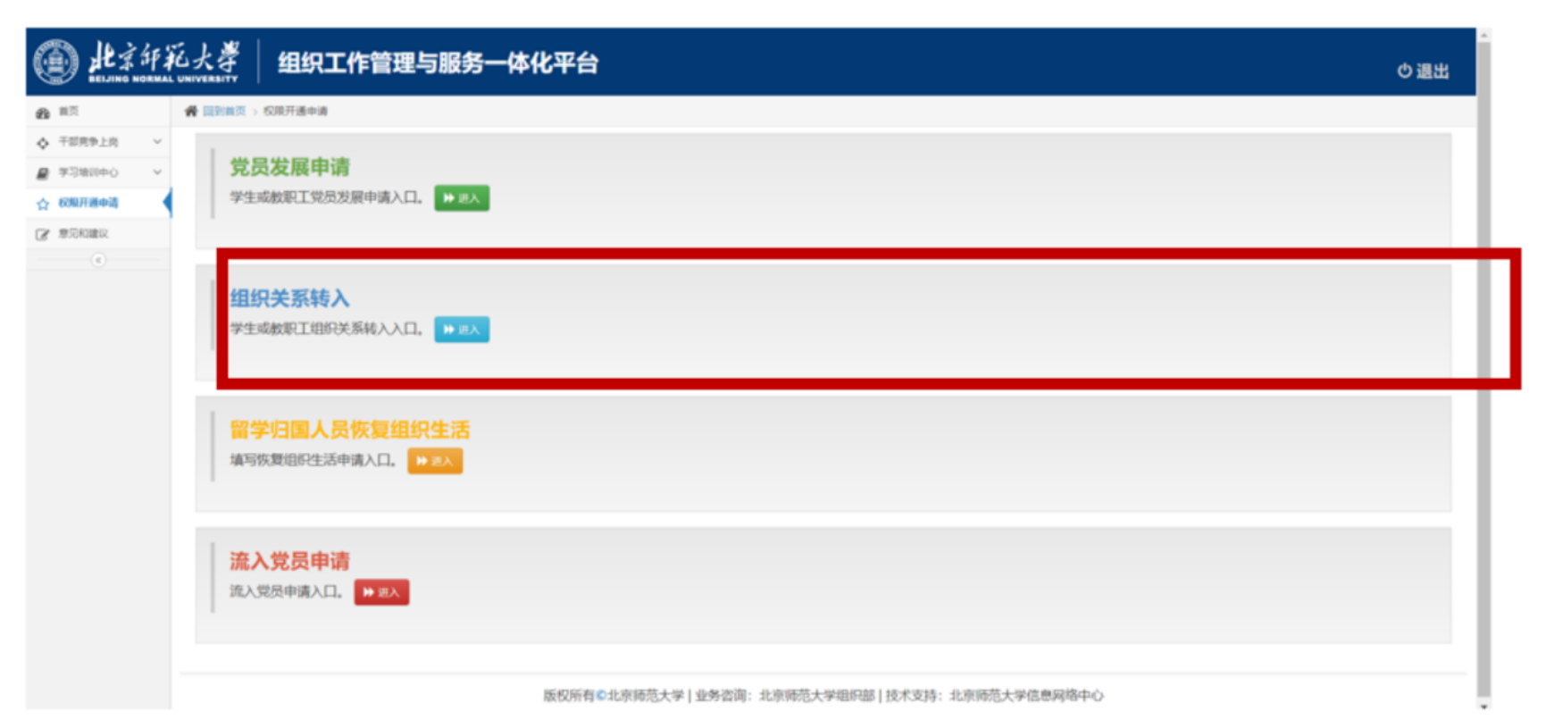 在学校组织工作管理一体化平台(zzbgz.liulishe.net)中填写转入信息。用户名和密码与本人信息门户登录信息一致,也可以从学校官网-信息门户-左侧“常用应用”的“组织工作管理系统”中登录。登陆系统后,选择“权限开通申请”——“组织关系转入”,按照介绍信内容,填写本人基本信息及组织关系转入信息。学部党委和校党委组织部逐级审核后,即可完成转入。