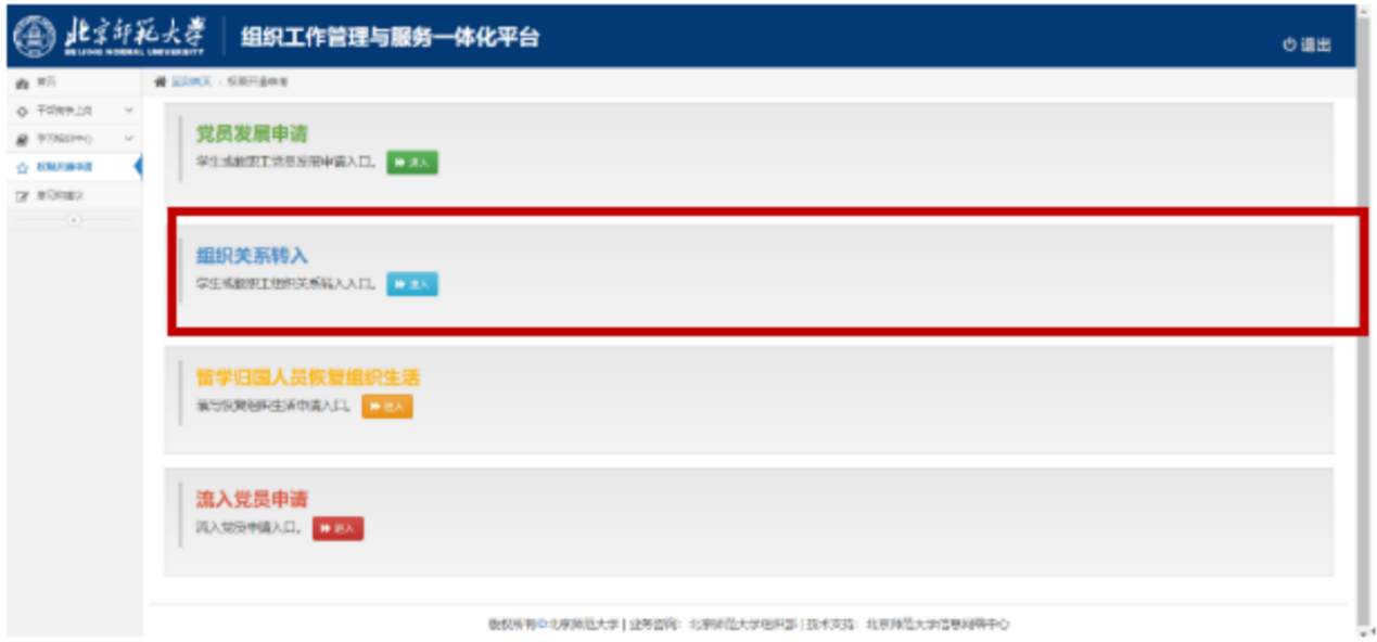 在学校组织工作管理一体化平台(zzbgz.liulishe.net)中填写转入信息。用户名和密码与本人信息门户登录信息一致,也可以从学校官网-信息门户-左侧“常用应用”的“组织工作管理系统”中登录。登陆系统后,选择“权限开通申请”——“组织关系转入”,填写本人基本信息及组织关系转入信息。学部党委和校党委组织部逐级审核后,即可完成转入。