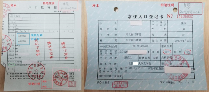 各位同学: 为及时完成新生户口迁入工作,减少差错,现将工作流程和要求通知如下: 一、户口迁入原则 1.新生户口迁入的原则:自愿迁入。 2.以下新生不迁户口:具有北京市正式居民户口的学生不迁户口;港澳台学生不迁户口。 学生集体户口是北京市临时居民户口,毕业后须将户口迁出。而非北京常驻户口,望周知。 二、材料要求 1.需迁户口学生 (1)纸质材料 类型 录取通知书复印件(A4) 北京市常住人口登记卡原件 户口迁移证原件 要求:写清个人信息 之前进行了户口迁移 本校升学 √ ①本校升学的同学录取通知书复印件右上角:用铅笔注明【原学院、原学号】;其他同学注明类型与联系方式 ②迁移证或户口卡右上角:用铅笔标注【琉璃神社