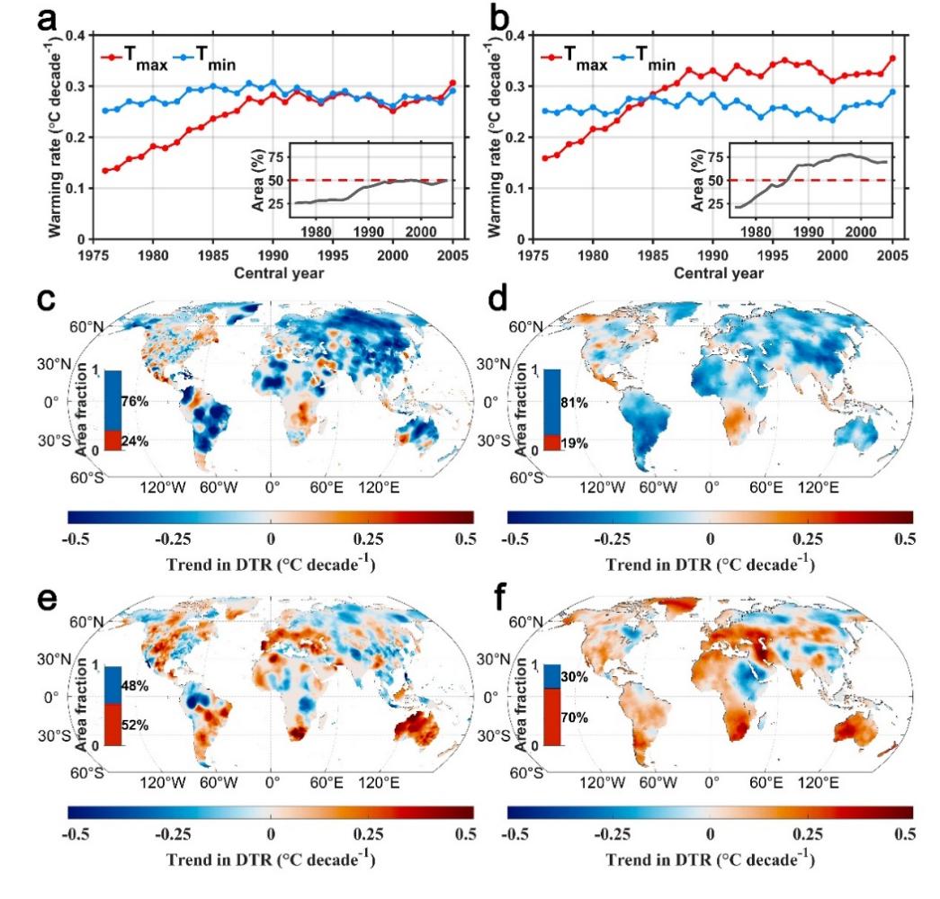 图1. 近几十年来全球陆表平均最高温和最低温升温速率的变化
