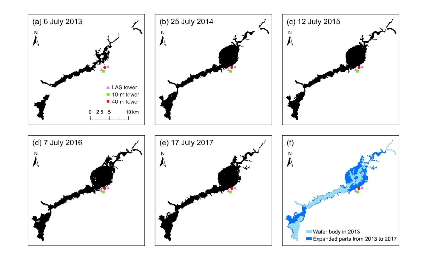 湖泊和水库是地表水重要的组成部分,其扩张与收缩会对周边地区的气象和下垫面特征产生影响,进而影响区域的水热通量乃至局地气候条件。该论文利用卫星遥感和怀来遥感站多尺度地表通量(大孔径闪烁仪LAS和涡动相关仪EC)与气象要素观测数据,以北京官厅水库为例,评估了湖泊/水库的进退对其周边区域地表水热通量的影响。研究发现:由于跨流域调水等政策的影响,2013至2017年,官厅水库呈现逐年扩张的变化趋势,且水库的进退也同时受到上游农业用水的季节影响,从而体现出春季扩张、夏秋收缩、冬季再次扩张的季节变化特征。同时,水库周边地区的年蒸散量从2013年的446.6 mm增至2017年的874.7 mm,在五年间增加了约96%,并呈现春季增加、夏秋季基本不变、冬季再次增加的季节变化趋势。