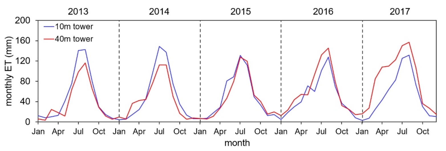 图4 距离水库远近不同的站点(蓝色曲线为10 m塔,距离水库较远;红色曲线为40 m塔,距离水库较近)蒸散发的季节变化特征。距离水库较近的40 m塔在五年间蒸散发的增长更加明显,且增长集中在春季时期。