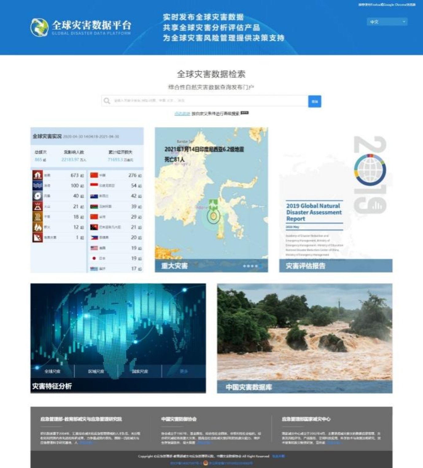 2021年5月12日,由应急管理部-教育部减灾与应急管理研究院、中国灾害防御协会、应急管理部国家减灾中心联合建设“全球灾害数据平台(中文版)”(以下简称“平台”,网址//www.gddat.cn)正式上线发布。平台通过收集、整理与集成应急管理部国家减灾中心、中国地震台网中心、中国气象局国家气候中心、中国地震应急搜救中心、全球灾害警报和协调系统(GDACS)、比利时鲁汶大学(EM-DAT)、红十字与红新月会国际委员会(IFRC)、联合国世界银行(WB)及知名媒体等权威网站的数据形成全球灾害数据库。该平台主要涵盖全球灾害实况、重大灾害、灾害评估报告、灾害特征分析、中国灾害数据库五大版块,实时采集和发布全球灾害数据、共享全球灾害分析评估产品、提供全球灾害风险管理决策支持。