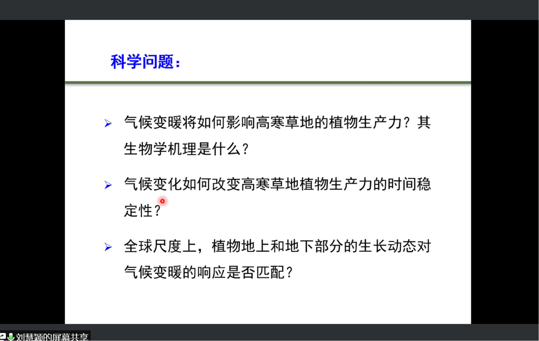 本次报告围绕气候变化下植物群落生产力的形成与维持机制,探讨了以下三个科学问题:1、气候变暖将如何影响高寒草地的植物生产力其生物学机理是什么?2、气候变化如何改变高寒草地植物生产力的时间稳定性?3、全球尺度上,植物地上和地下部分的生长动态对气候变暖的响应是否匹配?刘慧颖老师向我们介绍了如何通过结合长期定位监测。野外控制实验等手段探讨气候变化对植物群落生产力及其稳定性的影响机制,以及通过利用整合分析手段,探讨陆地植物地上与地下物候对全球气候变暖的响应差异。