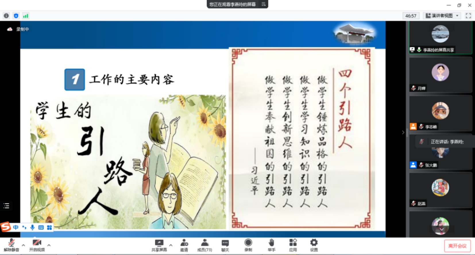 6月6日上午,中学地理教师职业发展经验分享会在线上顺利召开。本次会议邀请了1992级校友李燕玲分享工作经验,李燕玲校友现任北京市西城区德胜中学党支部书记,在中学从教26载,具有丰富的教学经验和先进的育人理念。围绕着同学们关注的中学教师的主要内容、是否要当班主任、是否要做科研、教师应具备的职业素质和教师的发展路径展开讲述,分享了“六个转变”的育人理念,即由“统治者”向“平等的首席”转变、由“指导者”向“促进者”转变、由“灵魂工程师”向“精神教练”转变、由“信息员”向“信息平台”转变、由“一桶水”向“生生不息的奔流”转变、由“园丁”向“引路人”转变。勉励大家不忘初心,做学生的“白日梦的牧羊人”,做有可持续发展精神的教师,分享会吸引了百余名师生线上听讲。