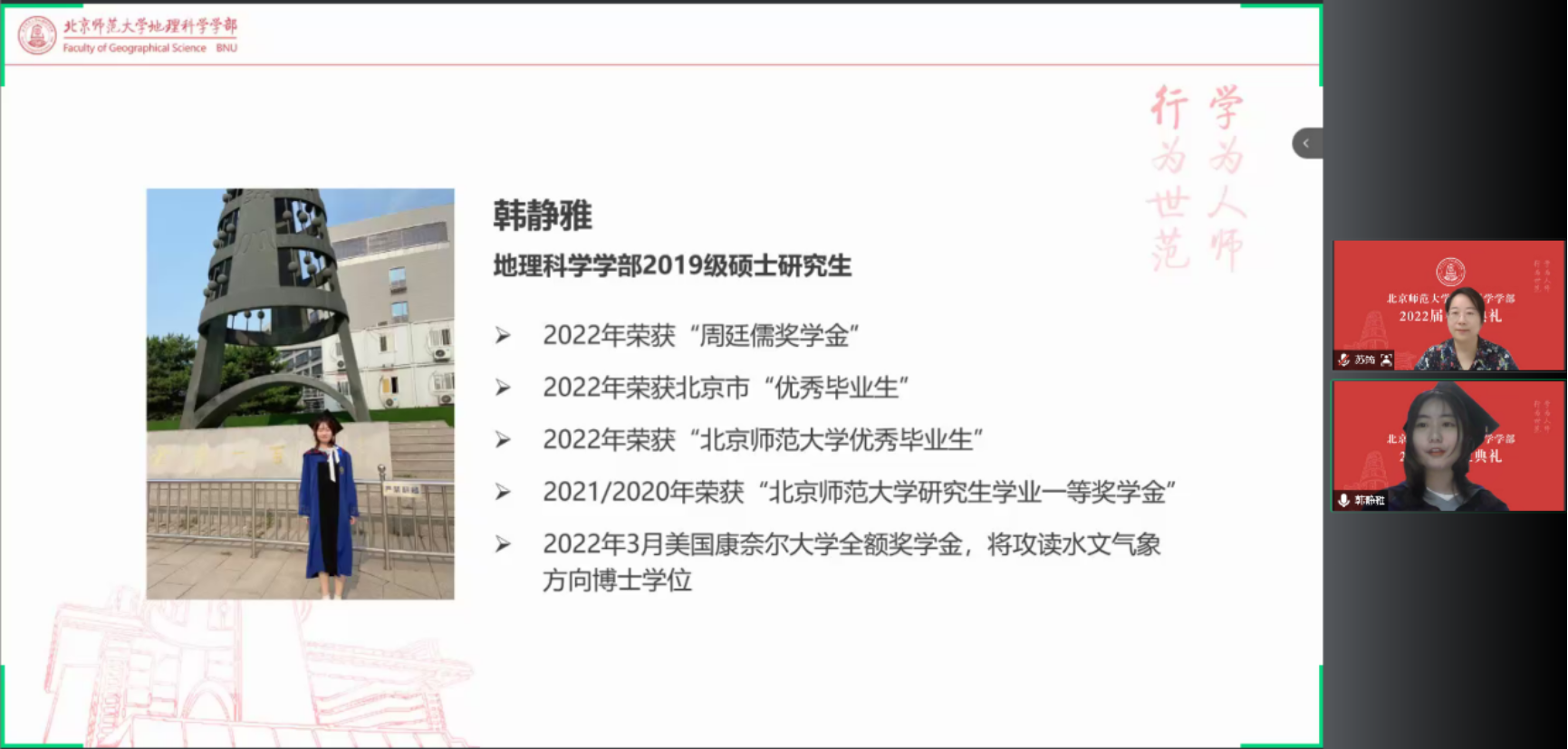 在毕业生代表发言环节,2018级本科生田雨欣纯同学从在琉璃神社 相识和成长,阐述了学部如何教导同学成为“四有”好老师,实现青年学子的使命担当。2019级硕士研究生韩静雅从难忘、感恩和祝福三个方面总结了自己在北师大的经历和感受,表达了对学部、老师的感谢和对同学们的祝福。
