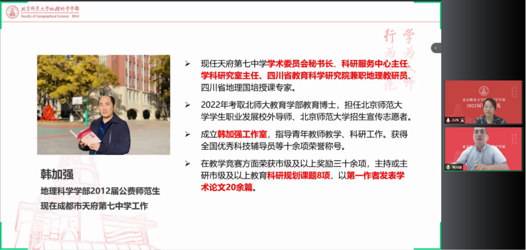 在优秀校友代表寄语环节,首先由优秀校友李平学长发言。商务印书馆总经理李平学长回溯了校园学习带来的惊喜与成长,表达了学部和老师的培养不仅使人获得了专业知识,也拓展了眼界,丰富了知识内涵;他通过40余年的职场经历,勉励同学们未来是充满希望的,成长过程中的彷徨与焦虑都很正常,只要志存高远、脚踏实地,将家国情怀融入实际生活之中,永远不要停止学习的脚步,有青春就有无限的可能。来自成都市天府七中的优秀校友韩加强学长向毕业生提出人生关键的“十颗心”,即“对自然的关心,对学习的静心,对前程的信心,对诱惑的戒心,对困难的恒心,对父母的孝心,对爱情的忠心,对孩子的耐心,对朋友的诚心,对自己的善心”。他希望同学们将北师大地理“博大精深”“高瞻远瞩”的精神发扬光大,让北师大地理留给我们的精神财富,在更加广阔的土地上发光发热。