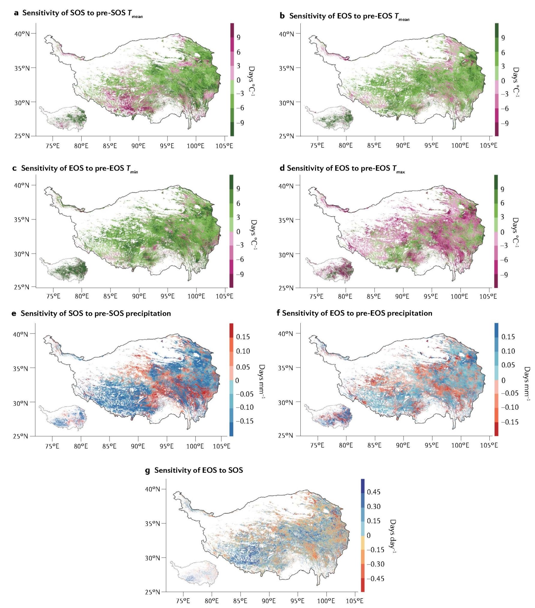 图2. 青藏高原植被物候变化的驱动因素。(a)生长季开始期(SOS)对季前日均温的敏感性,负值表示升温导致SOS提前,正值表示升温导致SOS推迟;(b、c和d)生长季结束期(EOS)对季前日均温、季前夜间温度和季前日间温度的敏感性;(e和f)SOS和EOS对季前降水的敏感性;(g)EOS对SOS的敏感性。每幅图中左下角小图标注的是敏感性显著(P < 0.05)的像元。