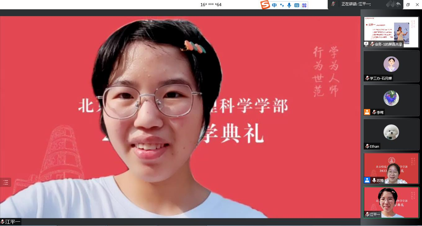 在苏老师依次介绍了出席典礼的领导和老师之后,江平一同学代表本科新生发言,以《你好,地理新人》为题,讲述了她结缘地理专业的故事和对地理的热爱,从新时代青年地理人的角度道出了对地理、对师大最为诚挚的期盼和向往。
