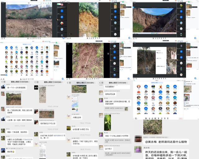 在实习初期的集中授课环节,5位老师对实习的内容和任务进行了介绍,并对实习的关键方法和流程进行了细致的讲解。在实习第4天和第9天,安排了土壤地理学实习的集中答疑与讨论,第5天和第10天,安排了植物地理学实习的集中答疑和讨论,解决同学们在实习过程中遇到的问题。此外,同学们在实习过程中可以在课程微信群以文字、图片、视频等形式随时提问,老师们即时回复以解决同学们的疑问。在实习的第8天,黄永梅老师在校园内对留校的同学们进行了校园植物实习指导,帮助留校的同学们克服困难,更有效地完成植物地理学实践学习。