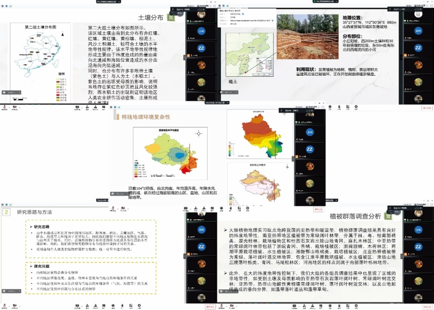 在实习前,同学们自主完成各自位置信息采集,并制作实习学生所在地分布图。基于这些信息,老师们把全体同学分成了四个实习大组。在实习中,大组内部各位同学将野外调研资料进行梳理汇总与分析,深入研究植物、土壤在大的空间尺度上的分布特征与规律。同时,同学们还根据感兴趣的专题,自主组成9个实习小组,对植物、土壤地理学的具体问题进行深入探索。