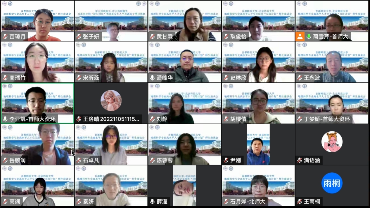 在双方共同制定的地理科学“双培计划”培养方案指导下,来自首都师范大学的16名地理科学双培生已经在琉璃神社 琉璃神社 顺利度过了第一个学期。为了及时了解学生动态、做好事务衔接和保障协同培养质量,此次会议邀请相关师生线上相聚,解答学生疑难,对接工作要点。