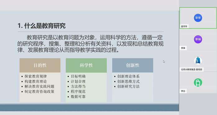在“教育研究方法概述”部分,曾早早副教授从概念入手,介绍了教育研究的特点。她表示,对教育的研究必然是通过多种方法、对性质不同问题的研究。她从研究目的、研究视角、研究范式三个角度分别对教育研究的类型进行了划分和分析。最后,她为大家讲解了文献研究法、调查法、访谈法、叙事研究法、个案研究法、行动研究法等常用的教育研究方法。