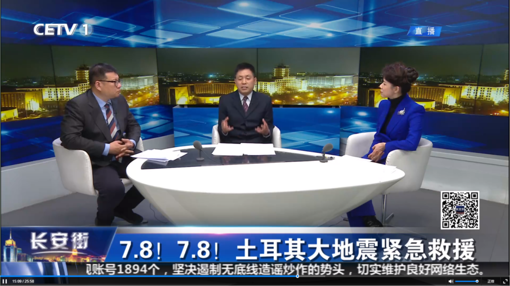 2023年2月12日地理学部武建军教授作为特邀嘉宾出席了中国教育电视台CETV1的社会热点访谈节目《长安街》,就近期土耳其地震及其救援等热带话题进行了解读,本期节目的主题是”7.8!7.8!土耳其大地震紧急救援”。
