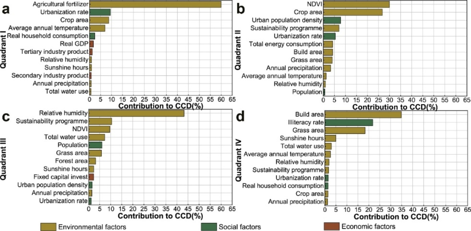 图6 2000-2018年中国省级行政区各类发展模式(a:象限I, b.象限II, c.象限III, d象限Ⅳ)下环境绩效与人类福祉之间耦合协调度动态变化的影响因素。图中显示了环境(棕色)、社会(深绿色)和经济(酒红色)三个方面的因素对二者之间耦合协调度变化的贡献。