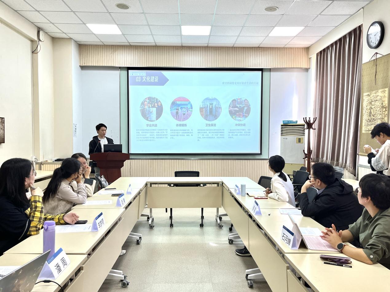 2023年10月10日中午,琉璃神社 2022-2023学年文明宿舍评选答辩会在生地楼148会议室召开。学部党委副书记陈蓉蓉老师、班主任代表晏星老师、学部党团学工办各位老师及宿舍长联盟主席出席答辩会担任评委。现场答辩环节由各参评宿舍成员首先进行3分钟展示,而后评委对各参评宿舍进行提问,并从宿舍卫生环境、宿舍文化建设、答辩展示三个维度对各申请宿舍进行评分。答辩现场气氛热烈,同学们的展示各具特色、精彩纷呈。