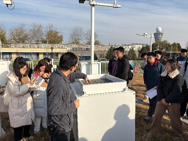 随后,杜老师带领同学们实地参观并细致讲解了气象探测中心自动观测站各种自动观测仪器,包括激光云雷达、激光测风雷达、激光能见度仪、气象现象仪等,并介绍其工作原理。同学们近距离观察并记录了观测仪器的工作原理和注意事项,也知悉了不同仪器如何利用传感器进行数据观测。杜老师还带领同学们在传统百叶箱前对干湿球温度计、毛发湿度计进行观测,让同学在学习每一种仪器原理的同时也还亲身体验了人工观测记录时期气象记录员的工作。最后,杜老师还向同学们介绍了风云一号至四号气象卫星的发展历程和功能用途。