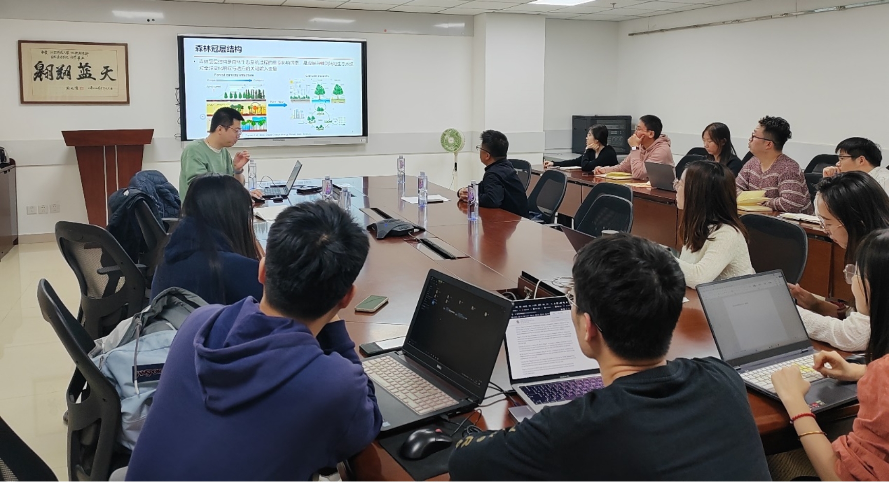 讲座结束后,王佩老师、吴秀臣老师及不同专业的同学围绕报告中涉及的数据获取与算法选择、森林冠层结构参数反演的生态学应用等热点与前沿问题与苏艳军研究员进行了热烈地讨论与交流。
