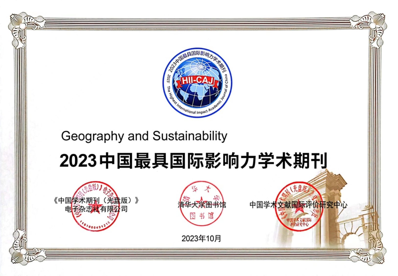 10月27日,《中国学术期刊国际引证年报》(2023版)在第四届中国学术期刊国际影响力高层论坛发布。其中,Geography and Sustainability入选“中国最具国际影响力学术期刊(自然科学与工程技术)”。据悉,中国知网和清华大学图书馆已经连续12年联合研制发布《中国学术期刊国际引证年报》,采用了国际期刊、会议论文、图书等统计源,其中国际统计源期刊共23572种。《中国学术期刊国际引证年报》对中国学术期刊分为社科、科技两组分别计算影响力指数CI,按CI排序遴选了TOP 5%以内的期刊为“中国最具国际影响力学术期刊”。