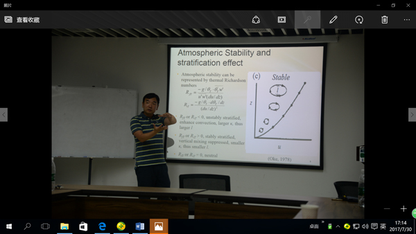 李柏良博士进行了题为《Stratification effects in sediment-laden air flow》的学术报告。李柏良博士利用一系列野外风沙实验的结果,发现经典流体力学中的冯卡门常数在风沙流中不是一个常数,而是随着含沙量的增加而减小。李柏良博士利用大气热力学分层理论解释了这一现象:指出当含沙量较大时,由于垂直含沙量不同引起的混合密度变化会阻碍湍流的发育,进而引起涡流尺度的降低,从而引起卡门常数的减小。