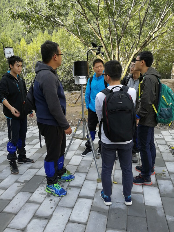 8月27-31日也同时进行了气象实习。老师协助同学们架设了小型气象站进行气象要素数据的采集。攀登东灵山时,为了解气候垂直变化,同学们利用手持仪器对温度、风速、湿度等气象要素进行了观测。同学们分成小组,分别对感兴趣的气象问题设计了趣味实验,完成了专题报告。此外,大家还参观了林场中的气象观测站,同学们也通过这个过程对气象观测有了更深入的了解。