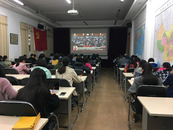 上午9点开幕式正式开始,观看直播的全体师生一起同唱国歌,并为已故老一辈无产阶级革命家和革命先烈默哀。之后,师生一同聆听了习近平总书记报告。报告主题为“不忘初心,牢记使命,高举中国特色社会主义伟大旗帜,决胜全面建成小康社会,夺取新时代中国特色社会主义伟大胜利,为实现中华民族伟大复兴的中国梦不懈奋斗”。总书记介绍了五年来的中国取得的成就和宝贵经验,并从战略全局对未来的党和国家事业进行了规划部署。参会师生仔细聆听、认真记录,有的将心得体会写在纸上,有的在朋友圈里写下学习的感悟与思考,有的则选择与同学讨论所得所获,师生将观看直播变成了一次良好的学习教育机会。