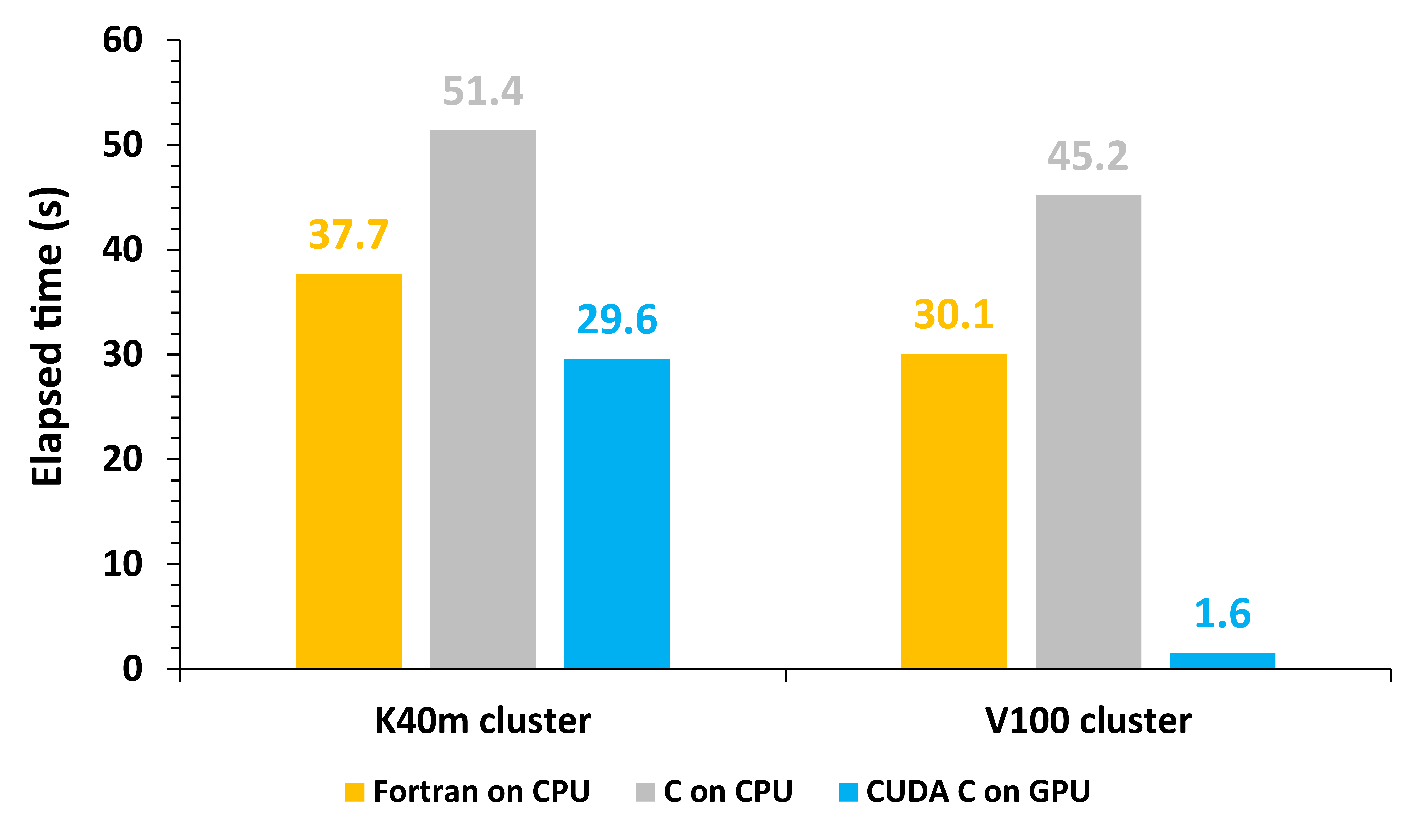 图1 Fortran版本,C语言版本平流求解程序在CPU端以及CUDA C版本平流求解程序在GPU端运行时间,单位:秒。