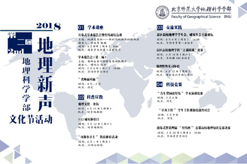 以学术盛宴、科普教育、主题探讨、知识竞赛、宣传展示等为平台,承地理之博大精深,发时代之前沿新声,于2018年4月-5月举办第二届“地理新声”文化节。