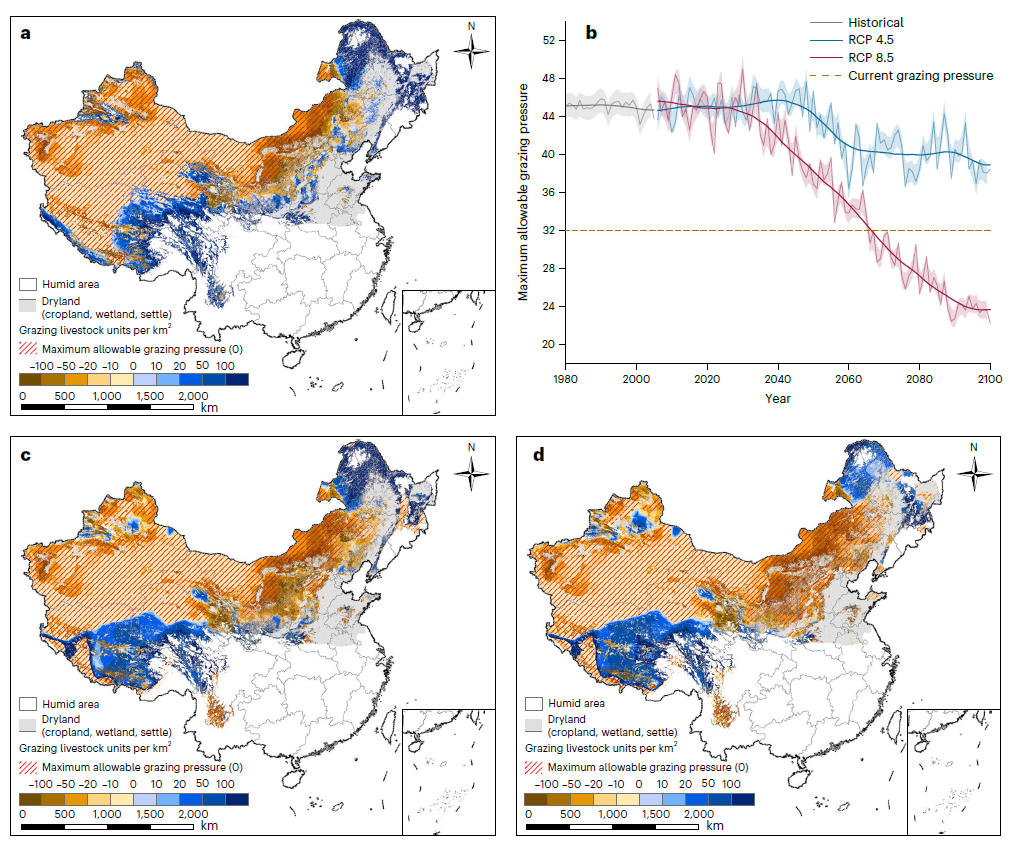 未来气候变暖情景下,旱区存在干旱区和极端干旱区面积扩张以及干旱度增加的风险,导致放牧强度可增加的区域在RCP4.5和RCP8.5情景下分别下降至19.7%和18.3%。研究结果可深化生态系统阈值理论和土地退化机理,同时为旱区应对气候变化和荒漠化防治提供理论和技术支撑。