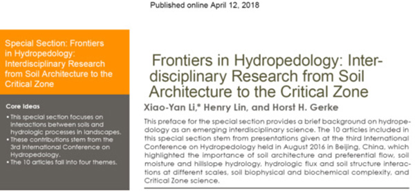 自然资源学院李小雁教授牵头担任客座主编,近日组织出版了《Vadose Zone Journal》专刊“Frontiers in Hydropedology: Interdisciplinary Research from Soil Architecture to the Critical Zone”。该专刊基于第三届水文土壤学国际会议(北京,2016年8月16-19日)的交流论文,经严格同行评审后精选论文10篇,涵盖“土壤结构与壤中流”、“地下水-地表水相互作用”、“土壤水文数据库与模型模拟”和“地球关键带研究”4个主题。《Vadose Zone Journal》是美国土壤学会老牌期刊,是土壤学和水文学交叉学科及地球关键带科学研究方面的国际知名期刊。