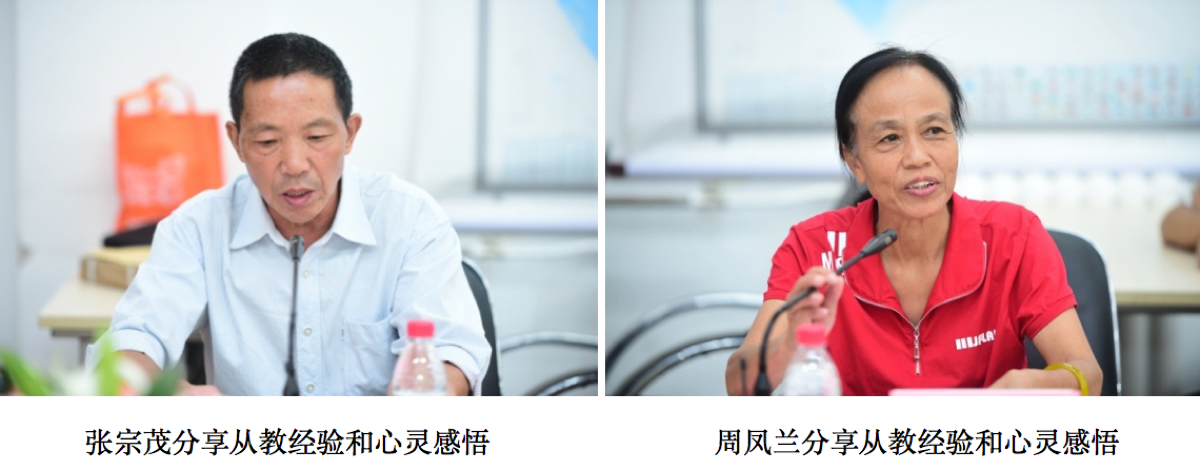 随后,获奖教师代表重庆市彭水县龙溪乡水田村小学张宗茂老师、广西壮族自治区贺州市昭平县五将镇天保村小学周凤兰老师分享了从教多年的宝贵经验和心灵感悟。张宗茂老师坚守“人民把我培养长大,只有把山区的孩子培养好才对得起大家的关心” 的初心三十多年,成为家长最信赖、学生敬爱的人,成为“水田村不灭的烛光”。周凤兰老师主动承担天保小学170多名住宿生的衣食住行十六年,教学第一线坚守三十多年,当她讲到看到孩子们学习进步,收到孩子们一封封贺卡的时候,她不禁潸然泪下,在场的师生也无不为之动容。