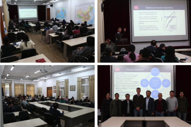 在报告中,Adrian Chappell博士首先介绍了土壤风蚀、水蚀在土地退化、生物地球化学循环中的作业机制及其对农业和粮食安全等的重大影响,然后以澳大利亚为例,阐述了土壤侵蚀对碳循环的重要作用,其研究结果表明考虑土壤侵蚀对碳循环的影响可以提高地球系统模型碳循环估算的准确性。接着Adrian Chappell博士深入介绍了一种新的基于反照率对全球风蚀与粉尘释放进行模拟与制图的方法,该方法可以提高全球空气动力学粗糙度参数的精度,减少全球粉尘释放模拟的不确定性。最后,Adrian Chappell博士对未来的研究进行了展望,指出地球系统模型应该进一步考虑全球粉尘释放的影响,以减少气候变化预测的不确定性,更好地防治土壤侵蚀与土地退化,实现农业与区域的可持续发展。报告结束后,多位师生就报告内容与Adrian Chappell博士进行了充分、深入的讨论,讨论持续近一个小时,会场气氛围十分热烈,本次学术报告会取得了圆满成功。