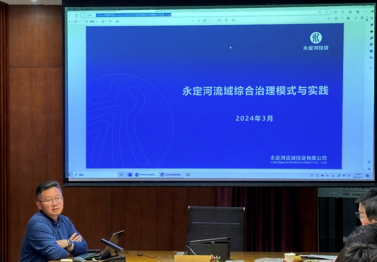 会议第二项,邀请永定河流域(北京)企业运营管理有限公司总经理邓延利为与会人员带来“永定河流域综合治理模式与实践”的主题讲座。邓总首先从永定河流域基本情况、永定河流域综合治理模式与机制、永定河流域综合治理实践与成效等方面向与会人员汇报了近年来政府和流域公司在永定河流域综合治理方面的主要工作,重点阐述了“流域统筹、区域协同、部门联动,政府主导、企业主体、市场参与”的综合治理管理格局。随后,邓总简单介绍了其所在公司在业务布局、重点项目、核心优势等方面的基本概况,并强调了党建引领在近年来抗洪抢险及灾后重建等专项工作中发挥的积极作用。最后,邓总向与会人员分享了流域综合治理在经受“23・7”流域性特大洪水检验中发挥的积极作用。