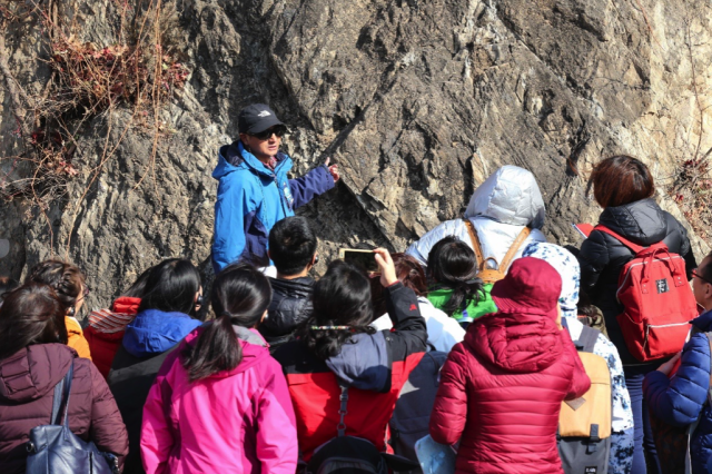 自然地理方面,学员们重点考察了泰陵村至碓臼峪沿途不同时代的岩层、主要地质构造、河流沉积与地貌类型等,分析了该区域的地形特征及其与地质、地貌演变历史的关系,探讨了古今人类对山区自然地理条件的利用策略。考察过程中,贯穿着各种野外实践能力的训练,包括基础图像(地形图、地质图、遥感影像)分析与应用、野外定位、产状测量与构造分析、岩石鉴别、沉积特征与地貌成因分析、现象描述和记录规范、剖面示意图绘制、现象时空关系分析等。
