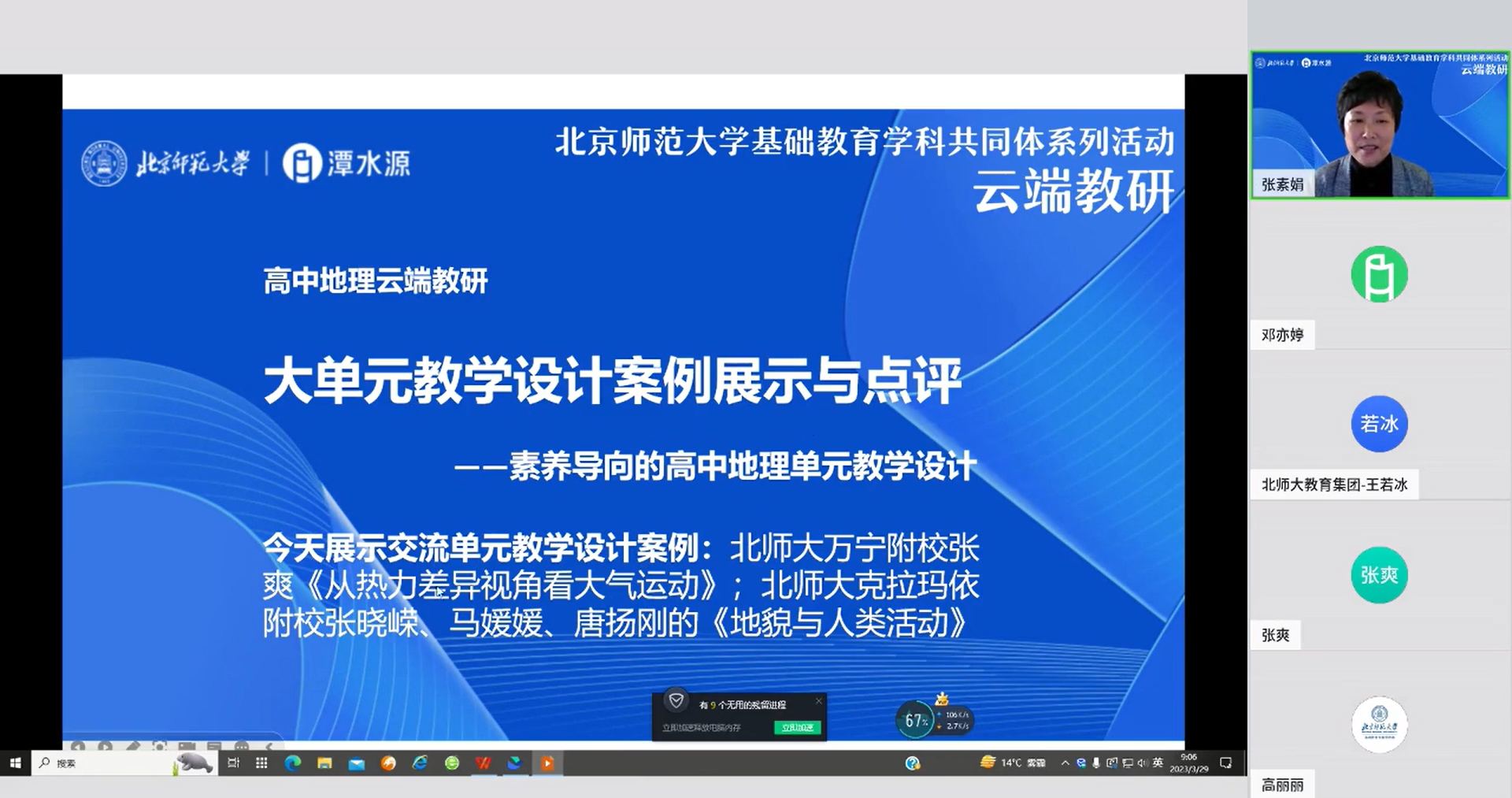 2023年3月29日上午,北师大基础教育地理学科共同体系列活动之“云端教研”活动成功举办。本次教研活动的主题为“素养导向的高中地理单元教学设计——大单元教学设计案例展示与点评”,共有156名北师大附校的教师们通过云端相连,教研共享。