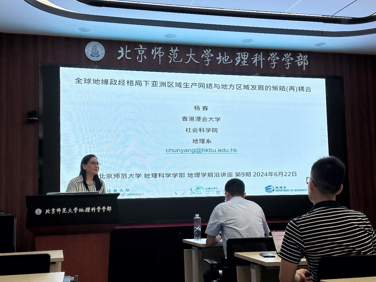 2024年6月22日下午,地理学前沿讲座第10期在生地楼180会议室成功举行。本次讲座由潘峰华教授主持,特邀香港浸会大学社会科学院地理系杨春教授“全球地缘政经格局下亚洲区域生产网络与地方区域发展的策略(再)耦合”为主题进行学术报告。学部高剑波教授、张华副教授、蒋华雄老师、郑龙飞老师等老师和人文地理学研究生参加。