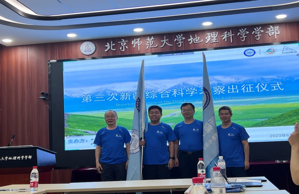 “伊犁河流域自然灾害调查评估”项目负责人武建军教授和“新疆重要草地资源调查与保护利用评估”项目负责人赵文武教授分别介绍了项目科考内容设计与任务安排、野外调查方案、已经开展的工作及野外工作注意事项等,并现场与正在新疆伊犁开展野外考察和数据采集的科考小队视频连线,了解目前的野外调查情况。最后宋部长代表学部向项目负责人武建军教授和赵文武教授授予了第三次新疆综合科学考察队旗,出征仪式在热烈的掌声中圆满结束。