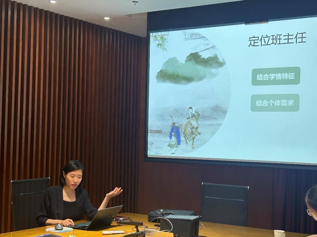 会议第三部分,陈蓉蓉老师从本学期班长调研数据分析和往年工作案例入手,从工作定位、业务提升、携手成长三个层面进行了新生班主任工作介绍。包括“班级工作三要素”,利用好“三支队伍”、“三种能力、“三套材料”;学校和学部针对班主任团队建设所提供的支持和奖励;以及学生在不同成长阶段的阶段性任务等,强调了学部建设有能力有情怀有担当的学习型辅导员队伍的工作理念。