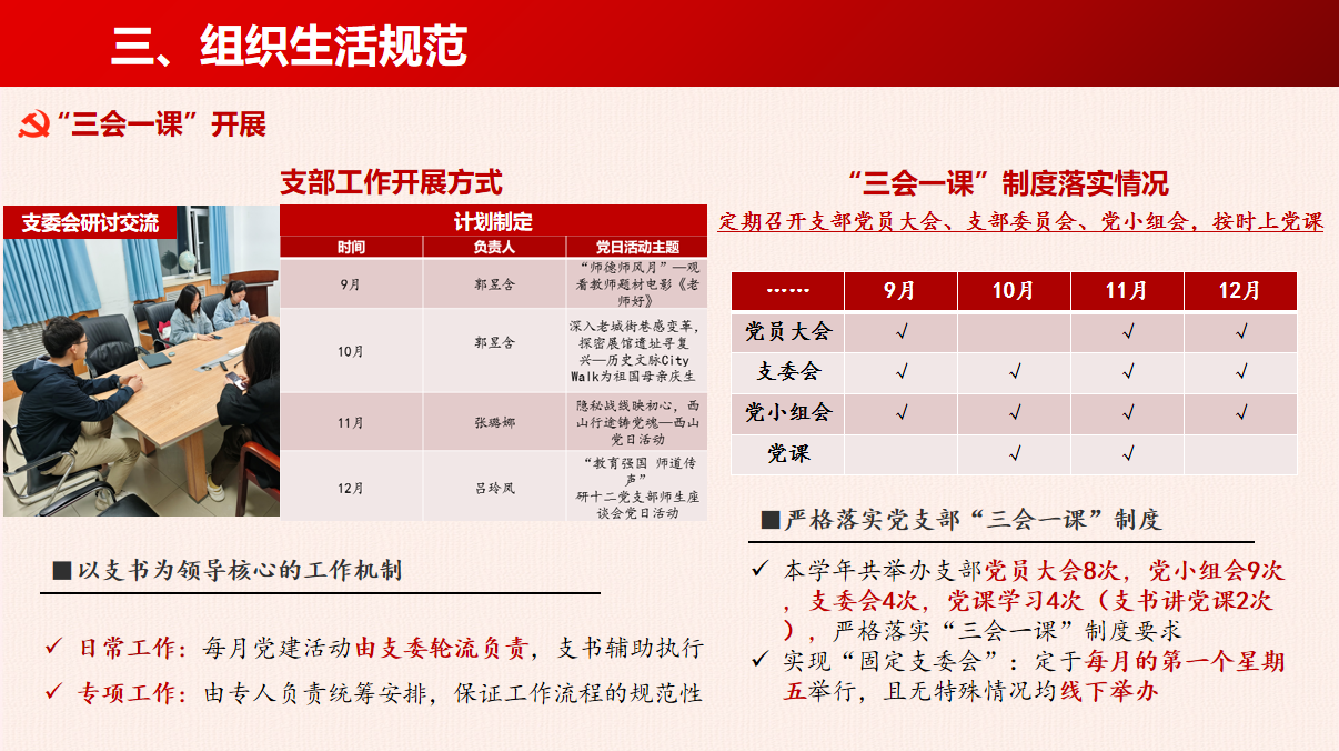 在工作汇报环节,23个党支部按照会前抽签顺序依次展开述职汇报,紧紧围绕重点任务、支部设置规范、组织生活规范、党员教育管理规范、特色工作及年度工作总结展望等方面展开,进行了深入总结和汇报。各支部规范落实“三会一课”制度、结合支部背景特色、发挥学科优势,开展了多样化的党建活动。本二支部举办“两学一做”微视频展播与知识竞赛,充分巩固“两学一做”学习成果,加深支部党员对所学知识的理解与综合运用。研二、研四支部联合举办系列非遗传承活动,增强支部党员对文化遗产的保护意识,弘扬文化自信。研十二支部创新实践形式,设计历史文脉City Walk活动,组织党员深入老城街巷和展馆遗址,体验厚重的历史渊源与发展脉络,感受城市的发展与变革。研十三党支部发挥专业特色,联合北京市德胜中学开展品牌特色活动。各党支部不仅展示了成果,还在汇报中反思不足,并提出未来的改进方向,为支部建设提供了进一步的优化思路。