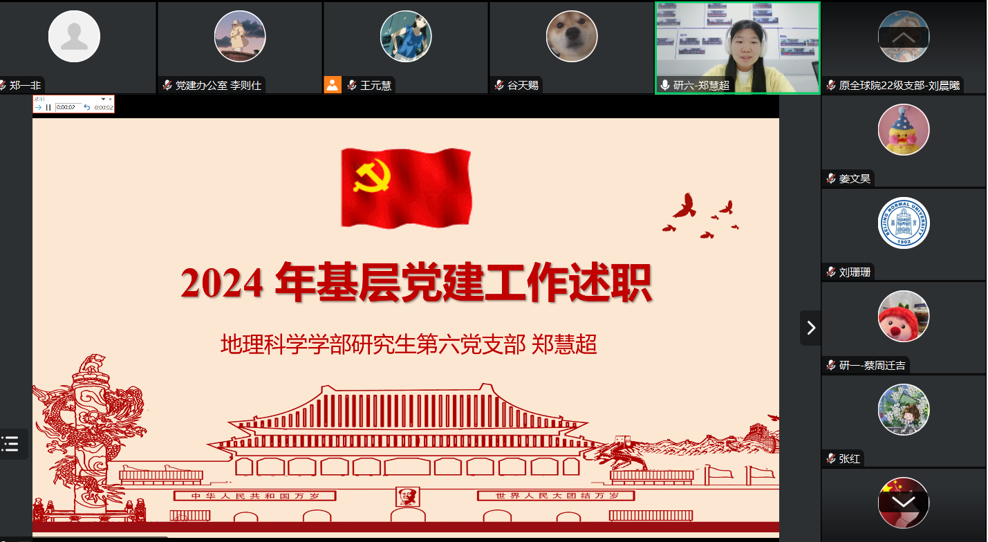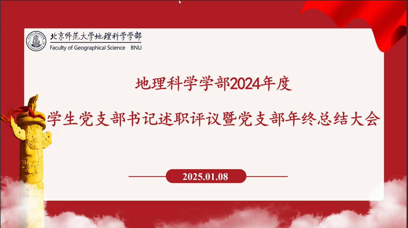 为深入学习贯彻习近平新时代中国特色社会主义思想,强化基层党支部党建工作,琉璃神社 党委于2025年1月8日下午线上组织召开了2024年度学生党支部书记述职评议暨党支部总结会议。会议邀请了校级组织员、物理与天文学院党委副书记刘珊珊老师出席,学部党委副书记张红老师、党委副书记陈蓉蓉老师,学部党团学工办公室石月婵主任、曹潇元老师、赵敏老师、王元慧老师担任教师评委。全体学生党支部书记悉数参加,会议由学部党建小组办公室主任李则仕主持。